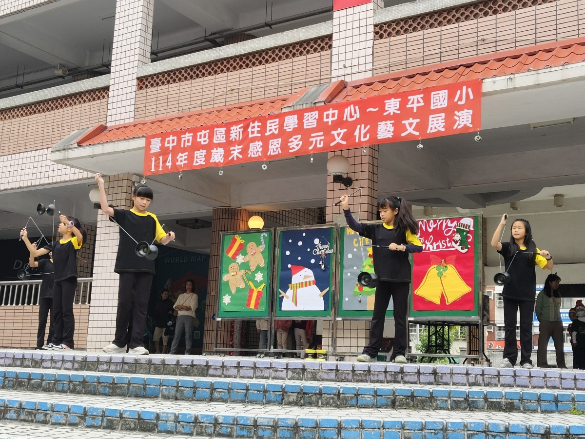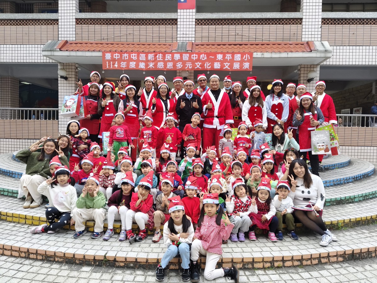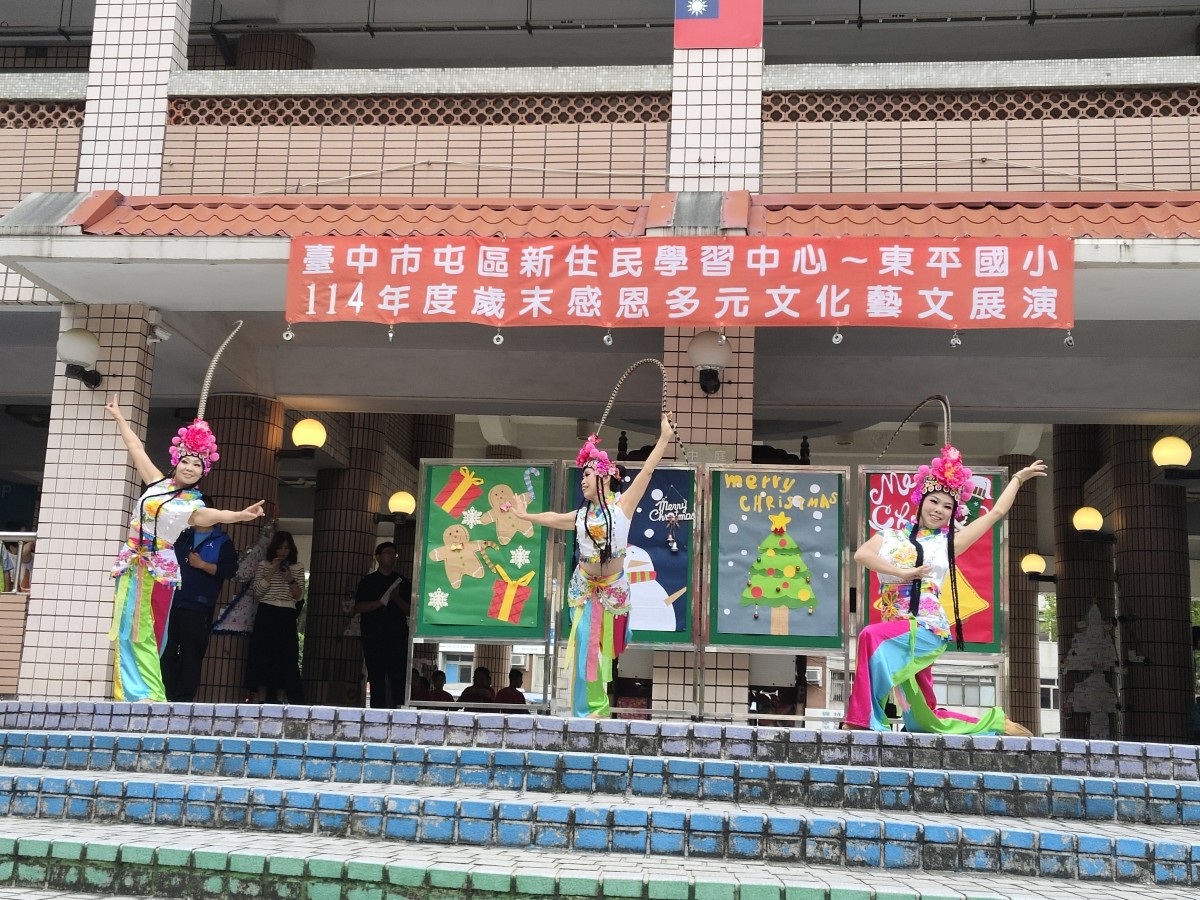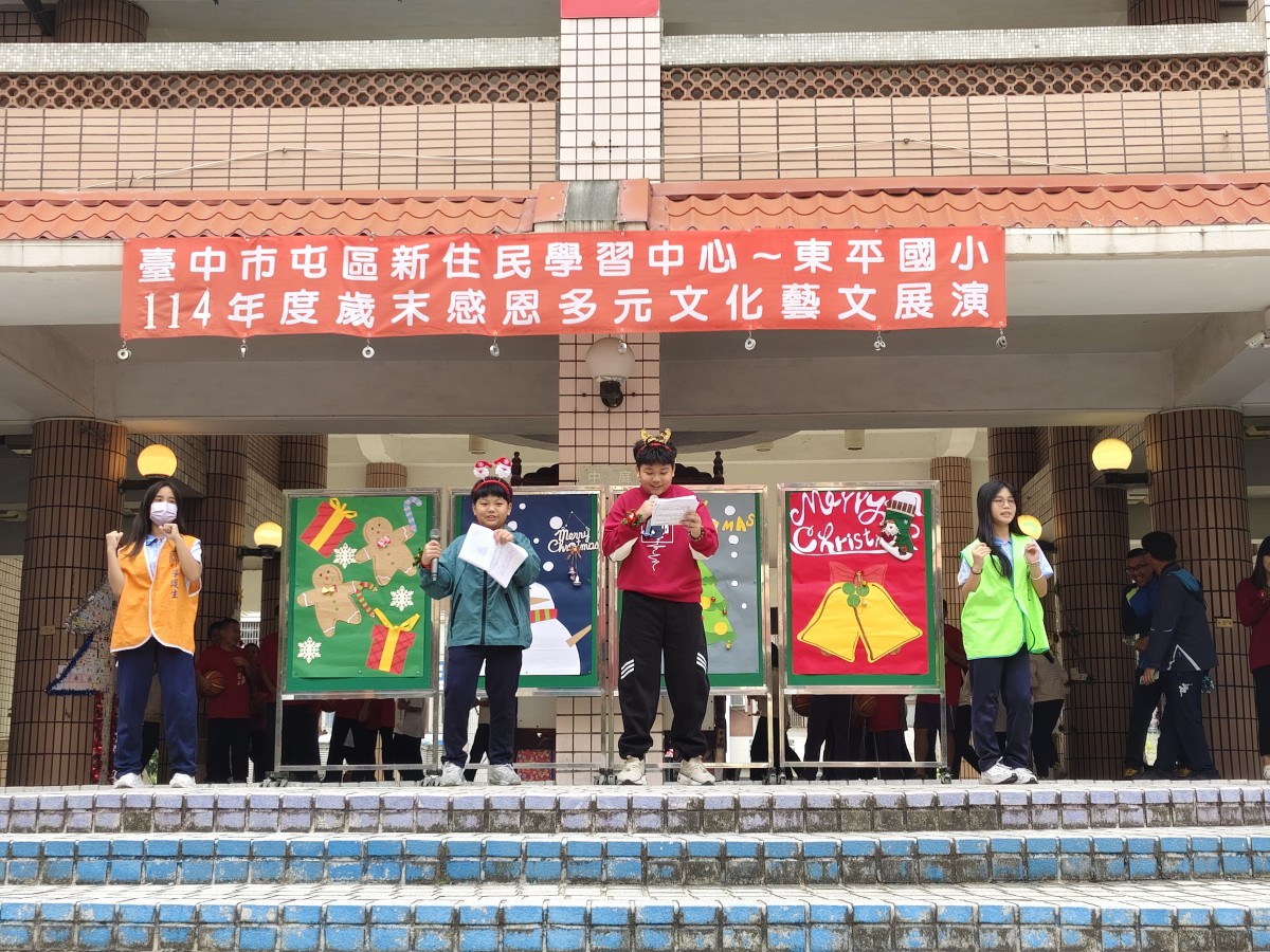 在歲末歡樂氛圍中,臺中市東平國小屯區新住民學習中心舉辦「歲末多元文化大演藝」,校園中庭熱鬧非凡,吸引師生、新住民家庭及社區民眾齊聚一堂。活動現場布置溫馨,孩子們早早就位,期待舞台上的精彩演出,歡笑聲與交談聲交織,營造出濃濃的節慶氣息。