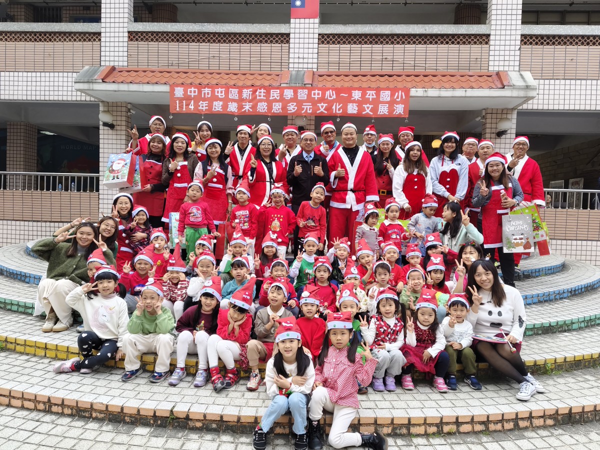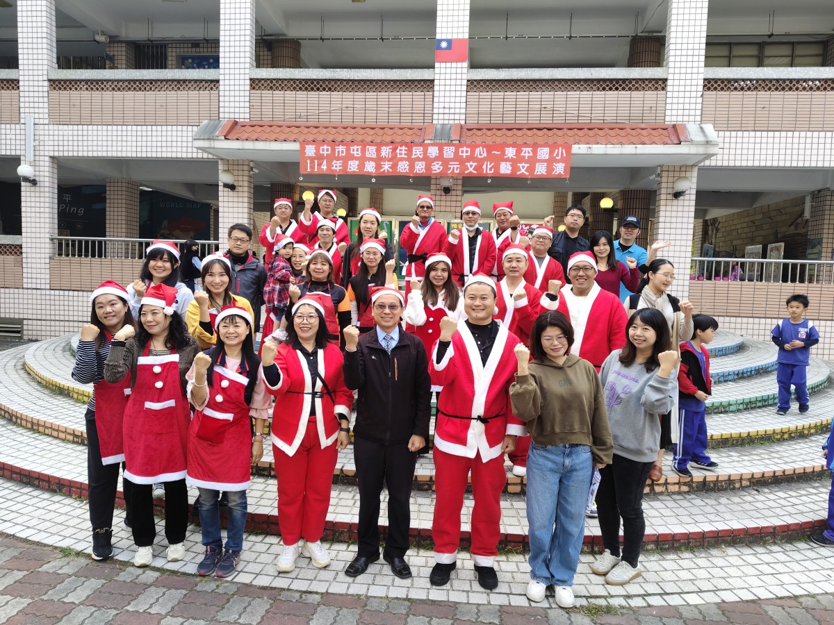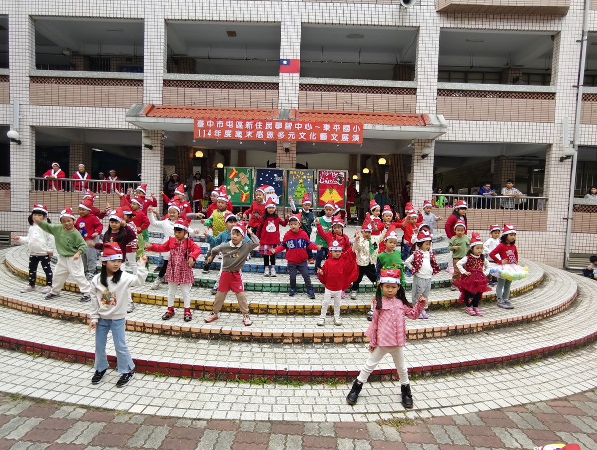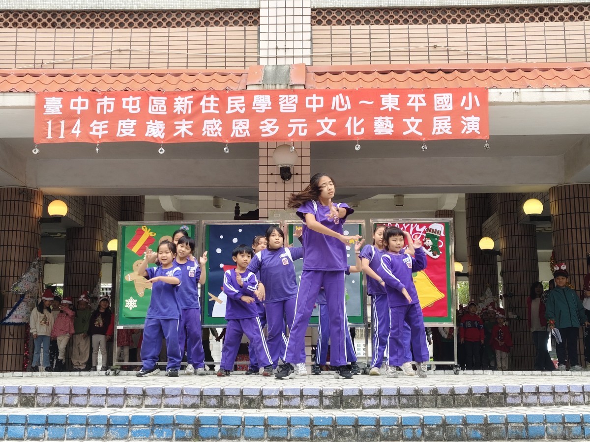 在歲末歡樂氛圍中,臺中市東平國小屯區新住民學習中心舉辦「歲末多元文化大演藝」,校園中庭熱鬧非凡,吸引師生、新住民家庭及社區民眾齊聚一堂。活動現場布置溫馨,孩子們早早就位,期待舞台上的精彩演出,歡笑聲與交談聲交織,營造出濃濃的節慶氣息。