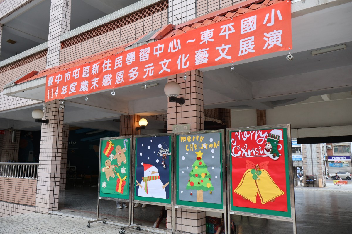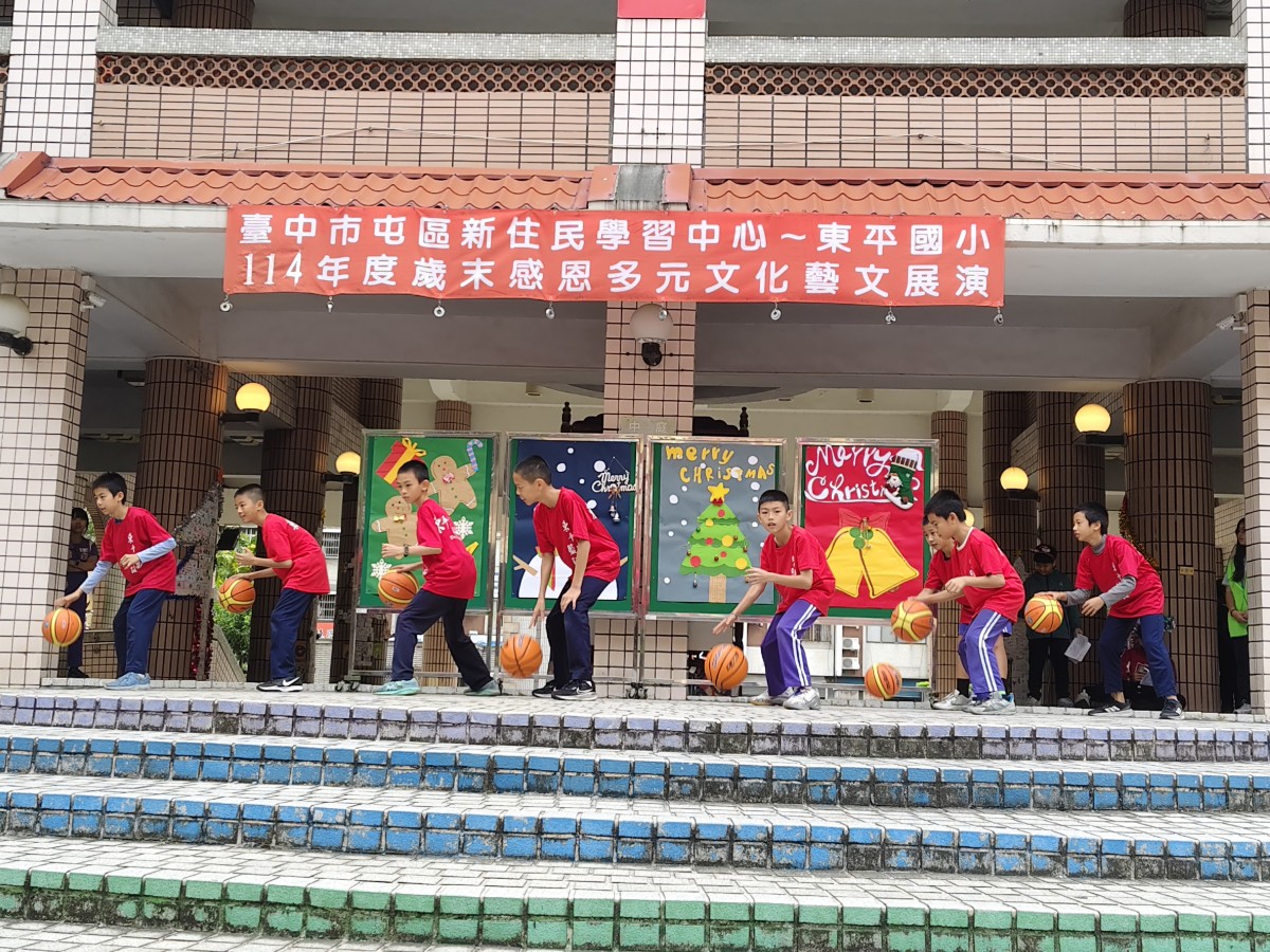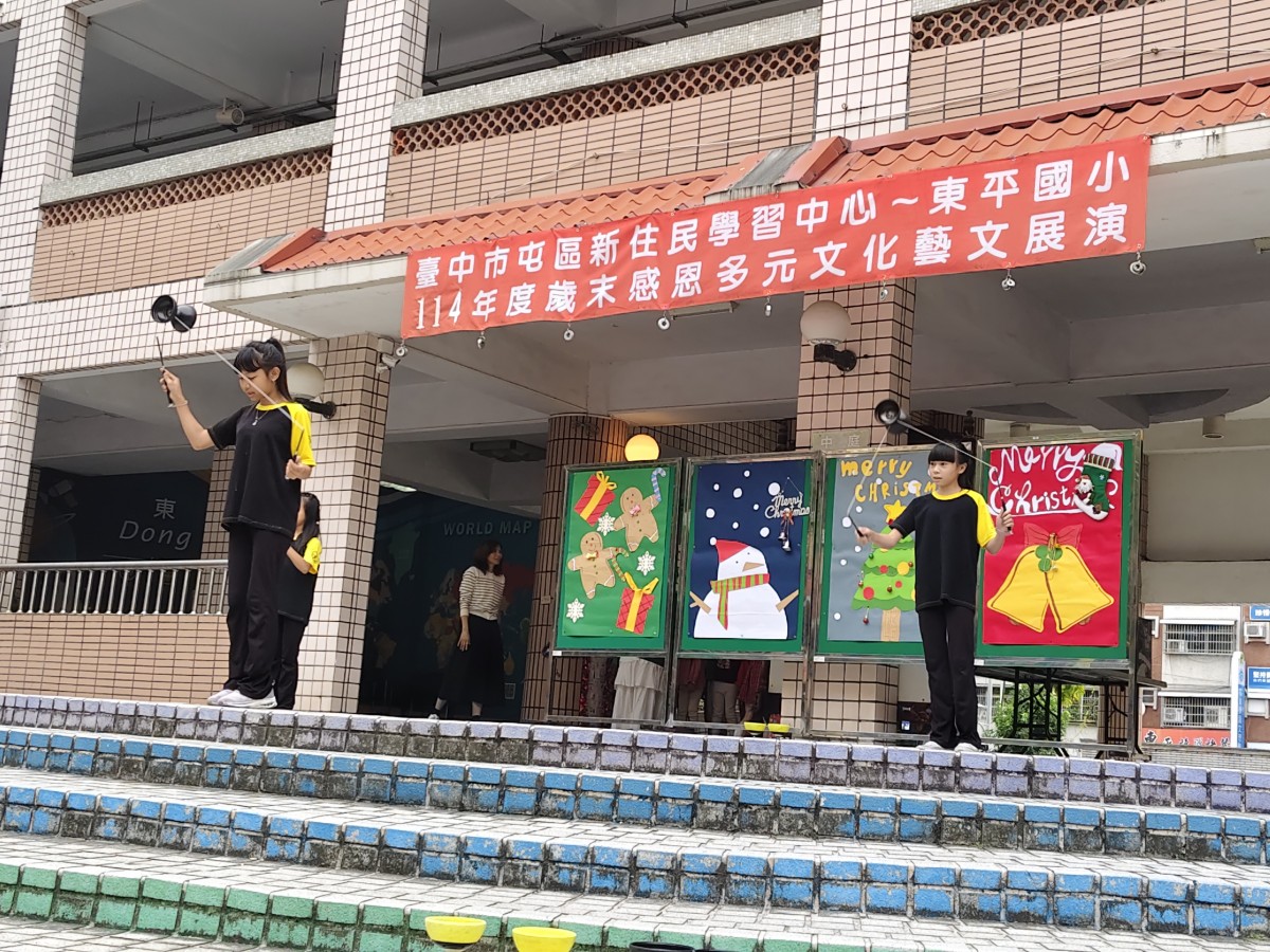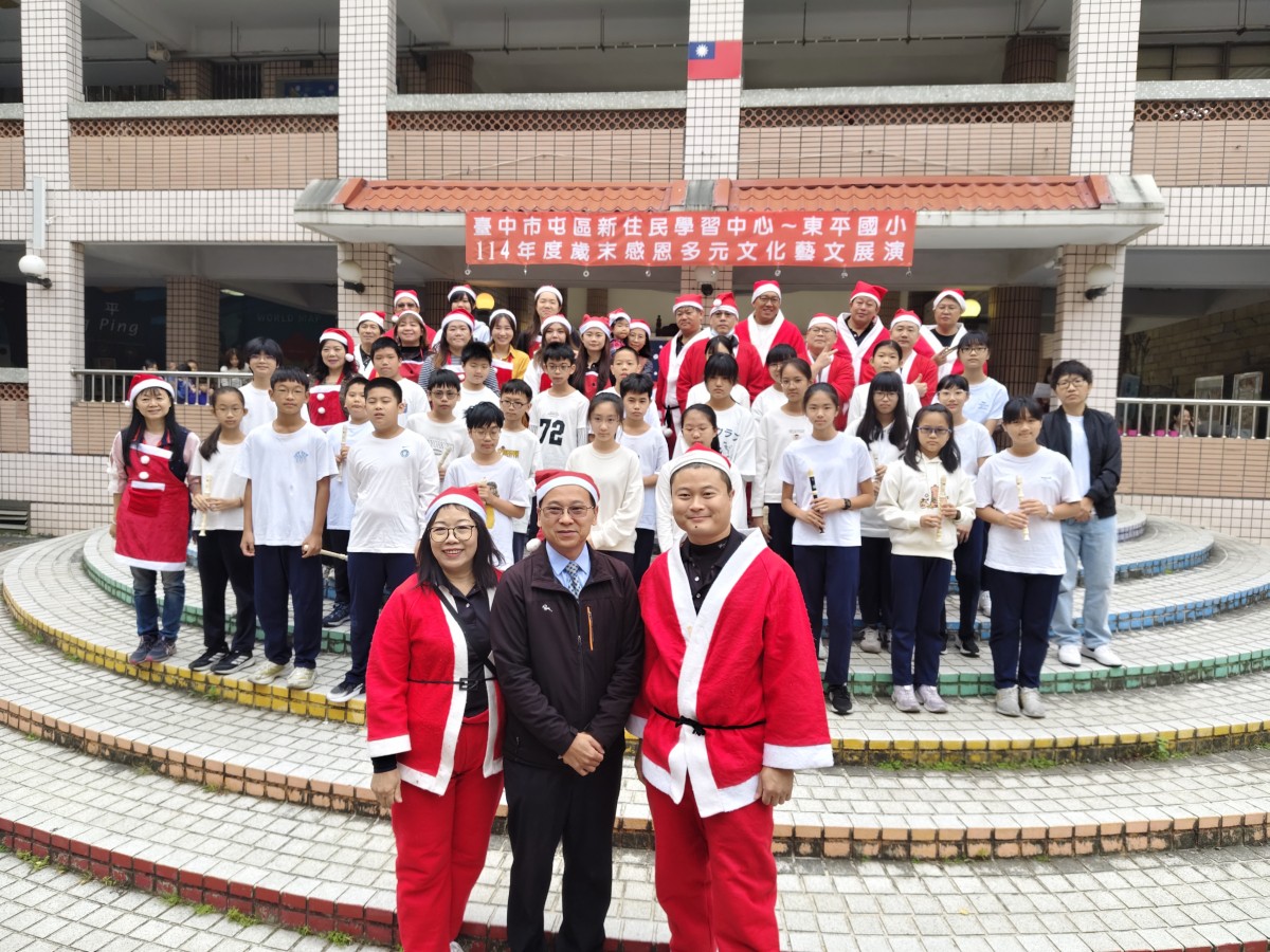 在歲末歡樂氛圍中,臺中市東平國小屯區新住民學習中心舉辦「歲末多元文化大演藝」,校園中庭熱鬧非凡,吸引師生、新住民家庭及社區民眾齊聚一堂。活動現場布置溫馨,孩子們早早就位,期待舞台上的精彩演出,歡笑聲與交談聲交織,營造出濃濃的節慶氣息。